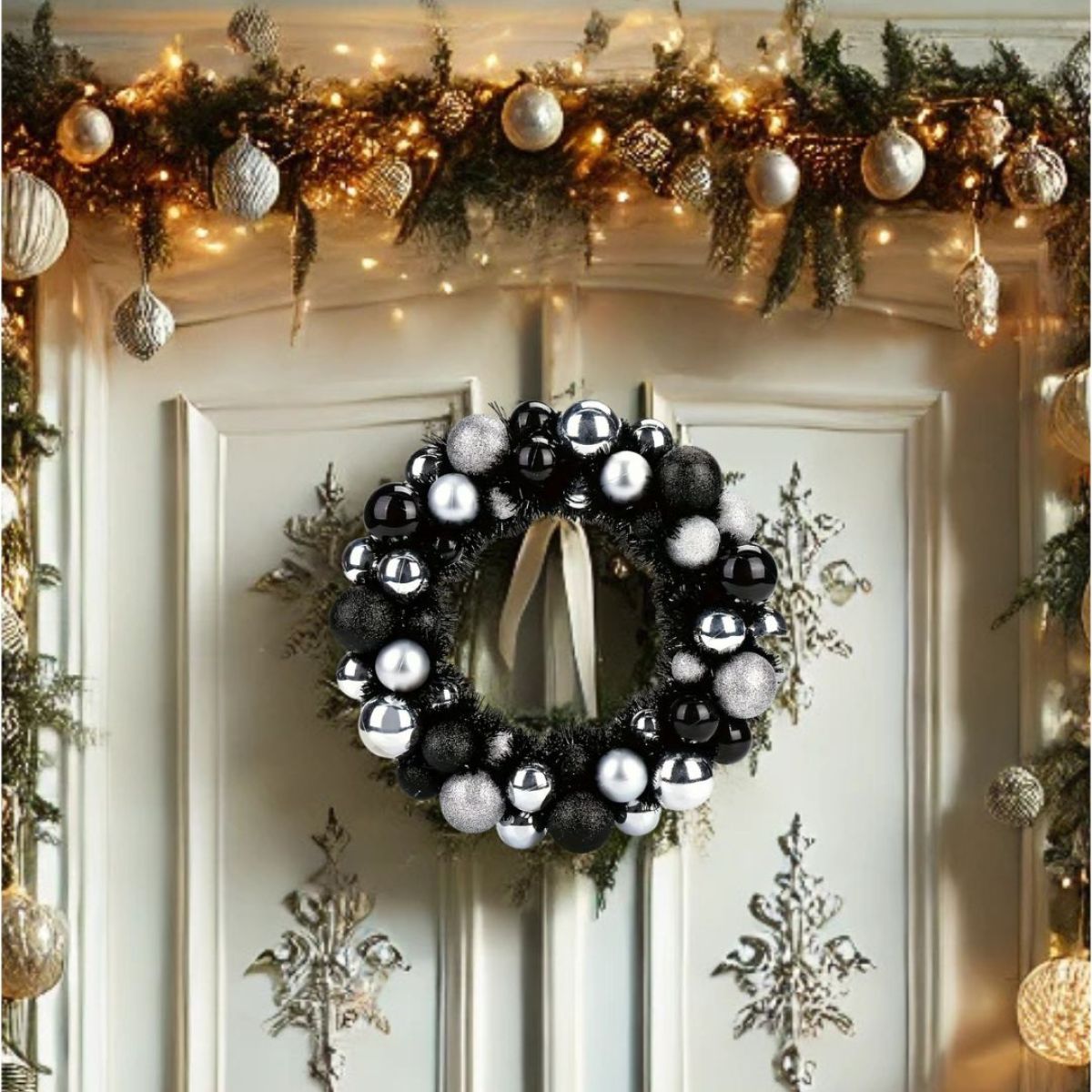 Puristische Schwarz-Weiß-Eleganz trifft auf glamourösen Glanz – perfekt für moderne Einrichtungen und stilvolle Weihnachtslooks. Der robuste Kunststoff bleibt in Form, lässt sich leicht reinigen und macht den Kranz saisonübergreifend mehrfach verwendbar.